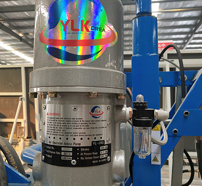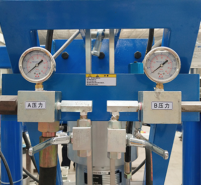采用可調(diào)式增壓同步聯(lián)動配比機構(gòu)。適應不同物料的配比要求(6:1-14:1),有專門比例檢測機構(gòu),配比調(diào)整十分方便,配比精度誤差小于±2%。