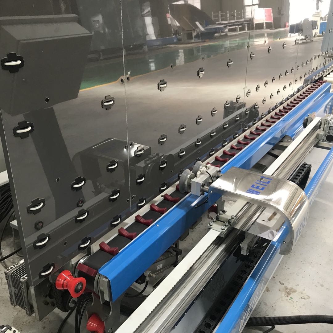 2、獨特的V型同步帶輸送,確保玻璃平穩(wěn)進行且不易粘膠